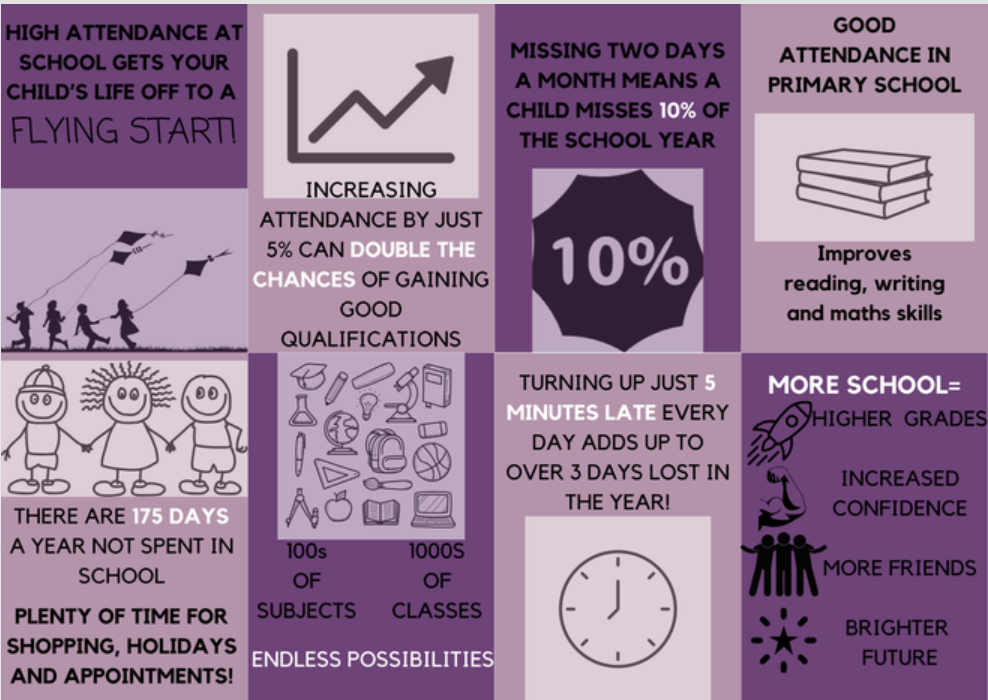 - A separate attendance newsletter is shared each half term which contains useful information and class percentages.