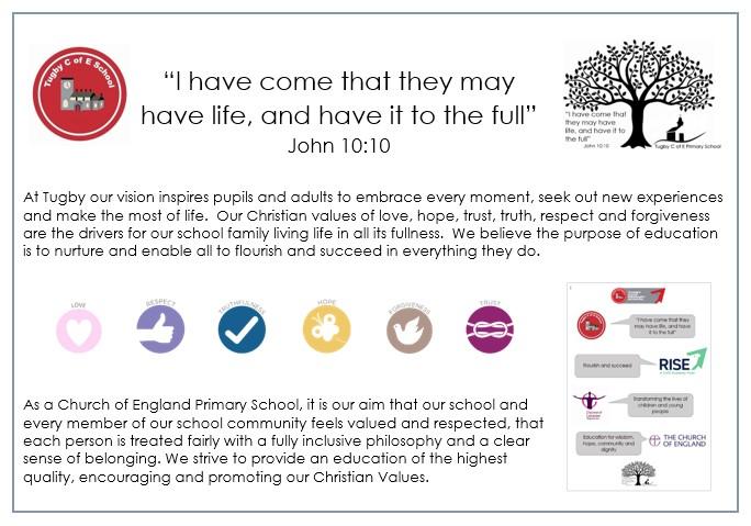 At Tugby our vision inspires pupils and adults to embrace every moment, seek out new experiences and make the most of life.  Our Christian values of love, hope, trust, truth, respect and forgiveness are the drivers for our school family living life in all its fullness.  We believe the purpose of education is to nurture and enable all to flourish and succeed in everything they do.